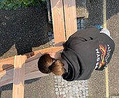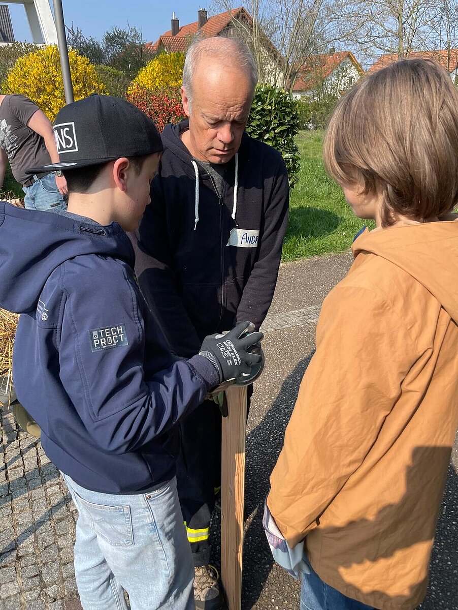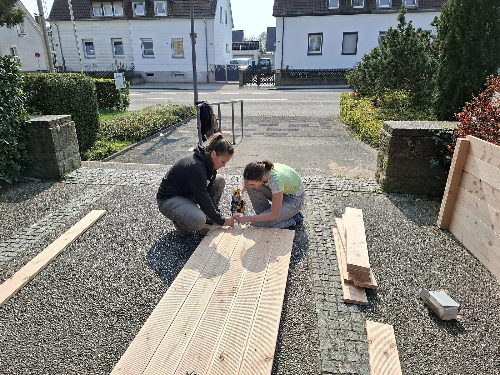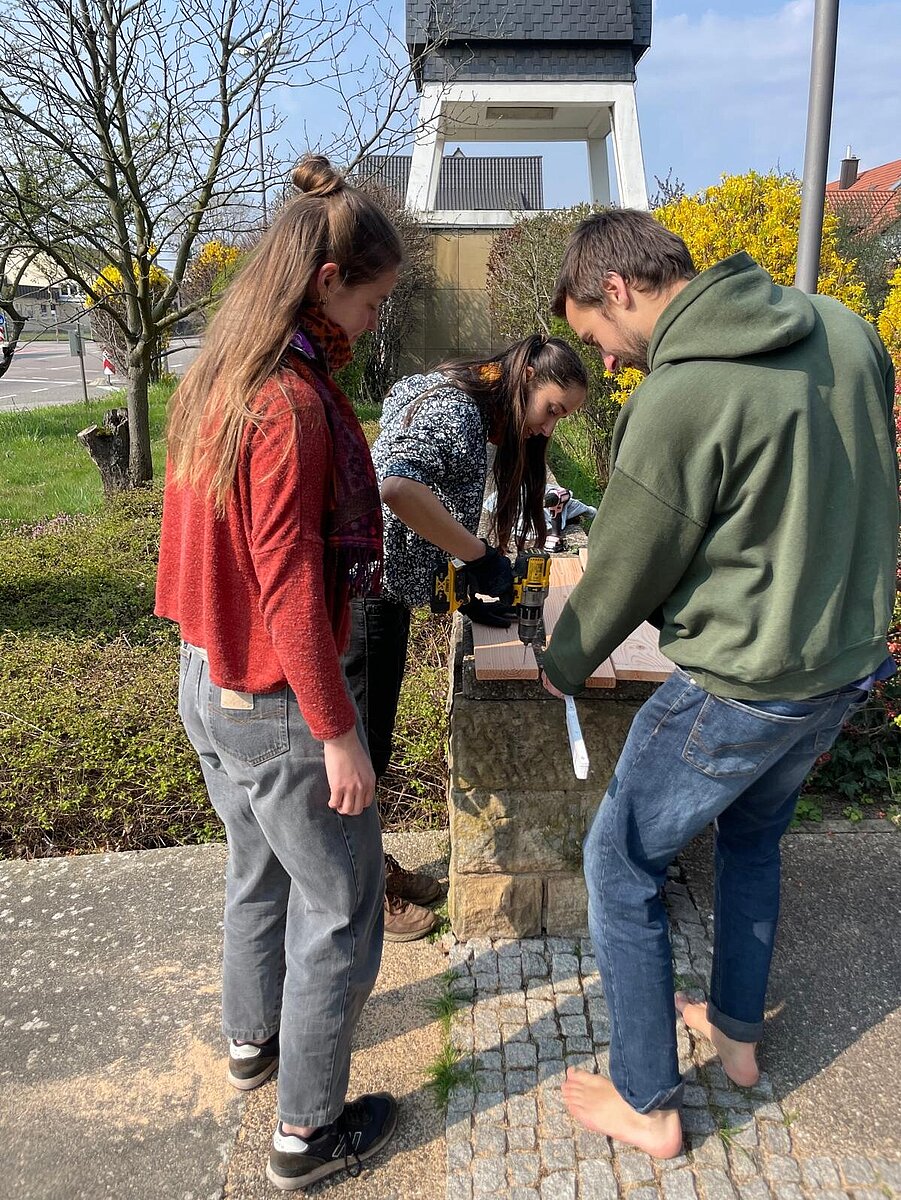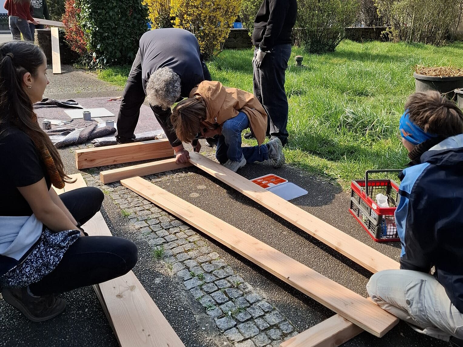 Dank einer großzügigen Spende von Hornbach war das benötigte Material schnell einsatzbereit. Die Konfis packten tatkräftig an: Latten wurden zugesägt, verschraubt und auf einem stabilen Untergrund aus Steinen aufgebaut. Bereits zur Mittagspause standen die Grundgerüste. Die sonnige Pause nutzten wir zum Essen und für den Austausch.
